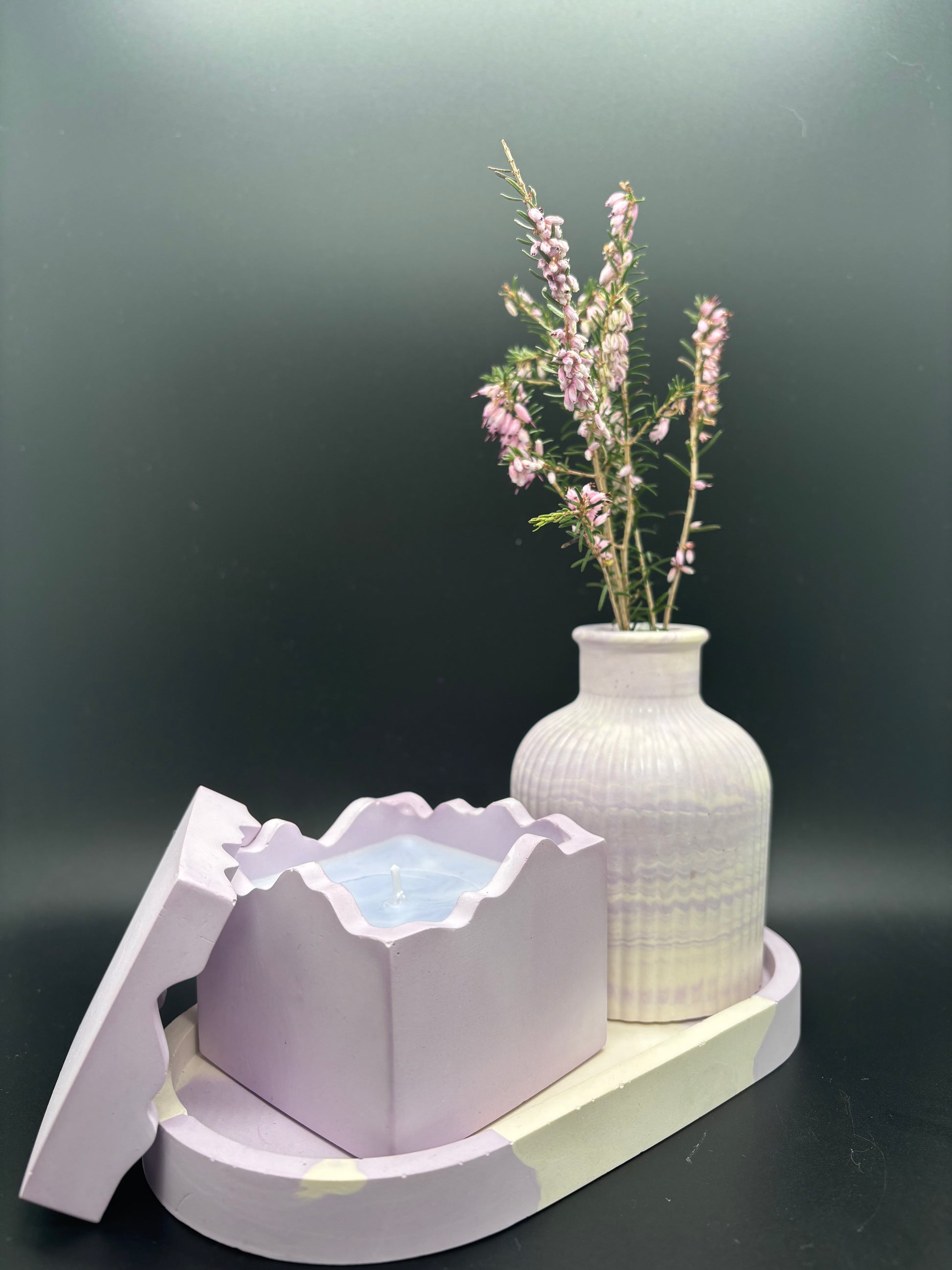 This aesthetic set is our best-selling item — and for good reason. It includes three elements: a gypsum tray, a vase for dried flowers, and either a candle or a candle holder, depending on the variation. Each set features its own unique color palette and selection, allowing you to choose the one that best suits your style and space.