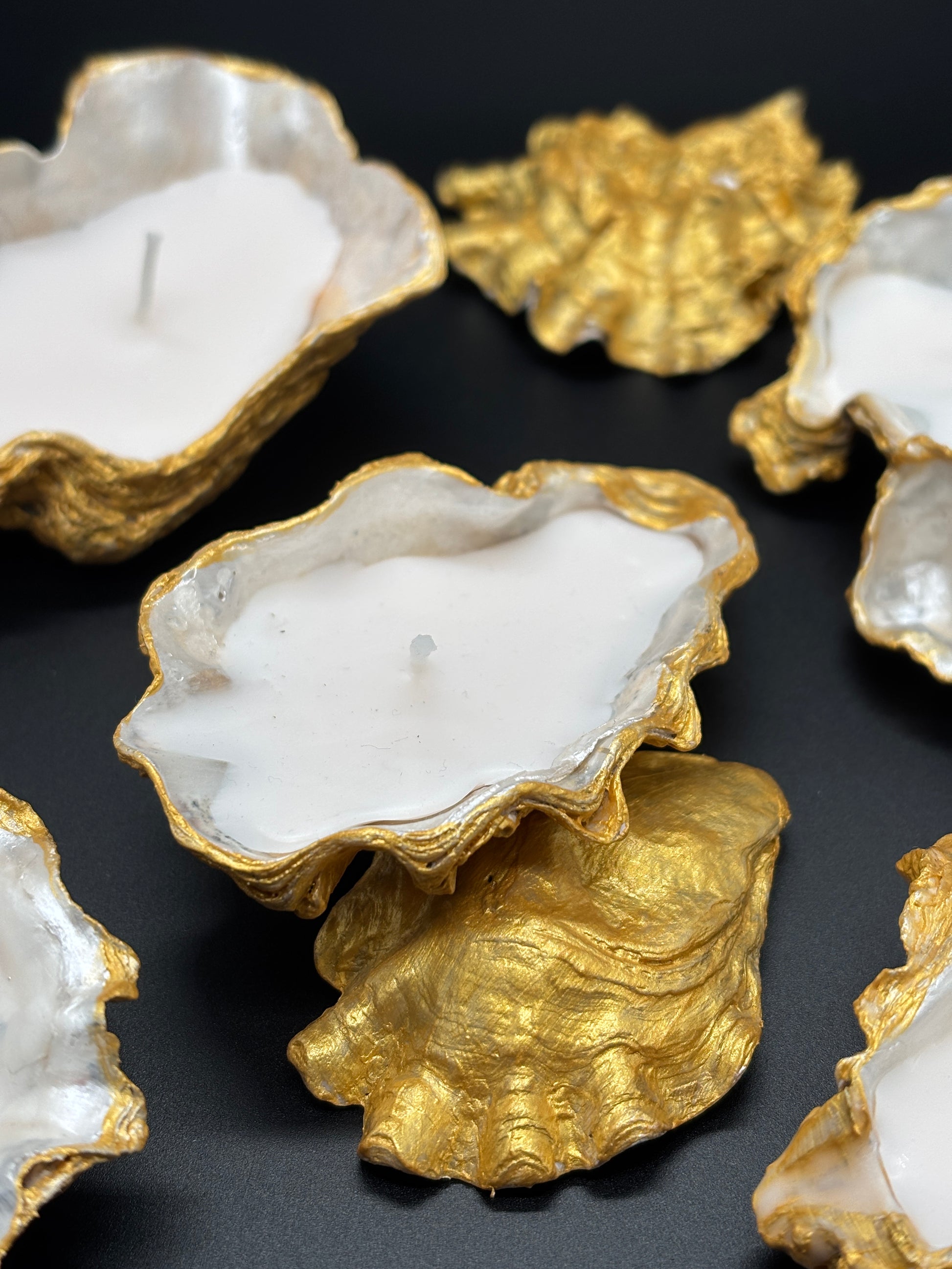 An elegant candle crafted in a real oyster shell with delicate golden details. Each piece is unique, shaped by nature itself.